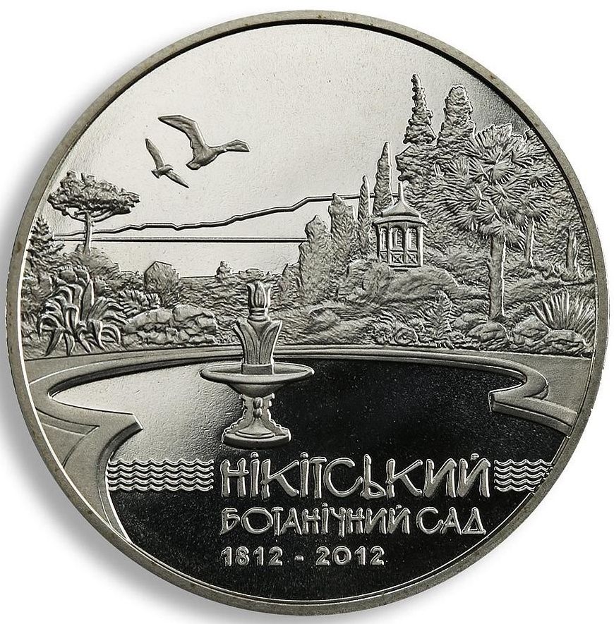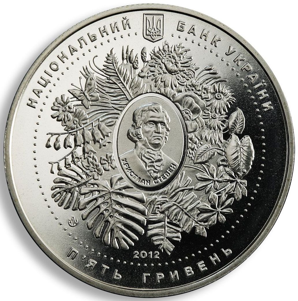 Описание: Зверху розміщено малий герб України з напівкруглим написом НАЦІОНАЛЬНИЙ БАНК УКРАЇНИ (Національний банк України); у центрі, на тлі стилізованого орнаменту з квітів і листя, зображено портрет засновника і першого директора саду з підписом під ним ХРИСТІАН СТЕВЕН (Christian Steven); внизу – рік випуску монети 2012 та півмісяцева легенда – П'ЯТЬ ГРИВЕНЬ (п'ять гривень) на білій мідній монеті. На останній, ліворуч, розміщено логотип Монетного двору Національного банку України.