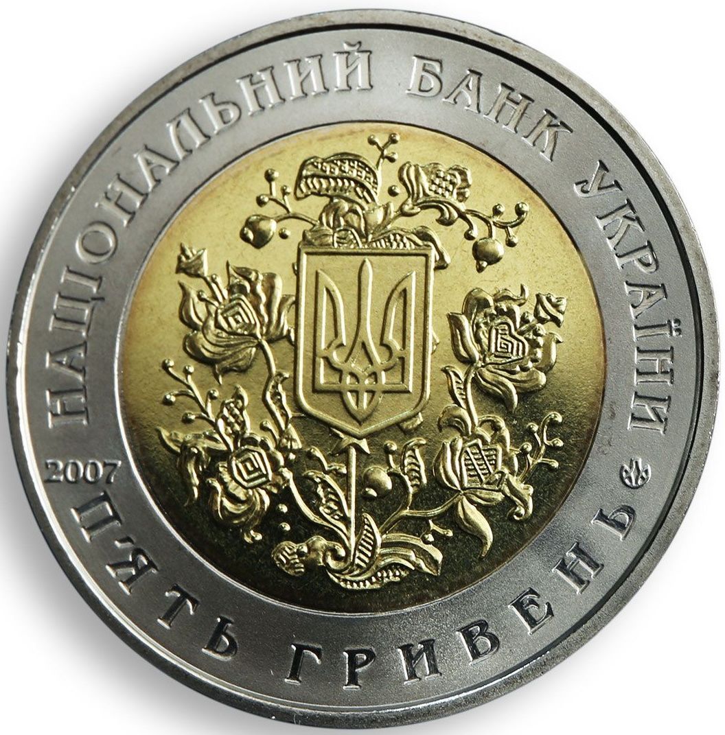Описание: У внутрішньому колі на тлі стилізованого українського орнаменту зображено Малий герб України, у зовнішньому колі розміщено напис по колу: НАЦІОНАЛЬНИЙ БАНК УКРАЇНИ (Національний банк України) зверху, 5 ГРИВЕНЬ (5 гривень) знизу, рік випуску монети: 2007 ліворуч, а також логотип Монетного двору Національного банку України.