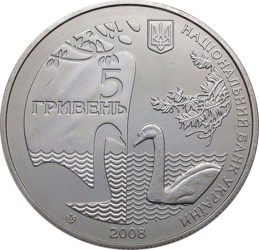 Описание: Дзеркальне зображення лебедів на тлі хвилястої води, номінал 5 ГРИВЕНЬ (5 гривень) ліворуч вгорі, малий герб України та напівкругла легенда НАЦІОНАЛЬНИЙ БАНК УКРАЇНИ (Національний банк України) праворуч, рік випуску монети 2008, а також логотип Монетного двору Національного банку України внизу.