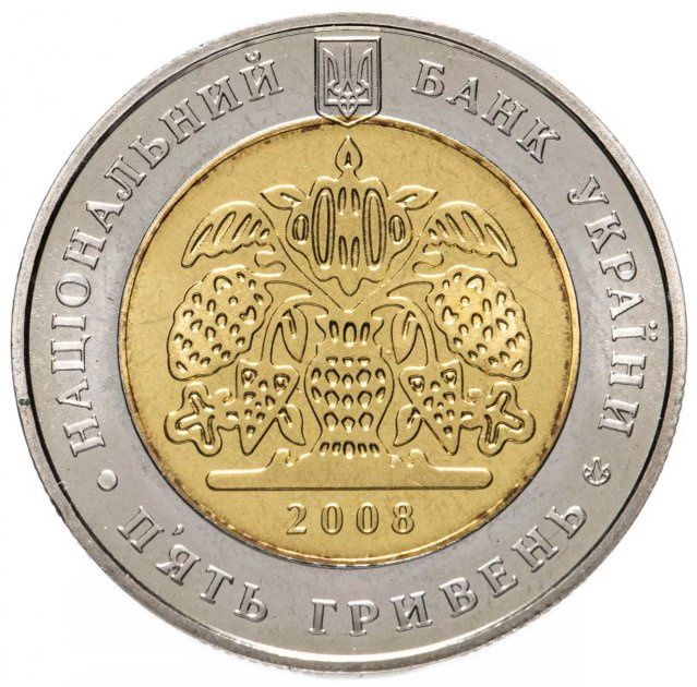 Описание: У центральному колі зображено дерево життя як орнаментальний візерунок, під яким вказано рік випуску; зверху розміщено малий герб України; на кільці навколо розміщено напис: НАЦІОНАЛЬНИЙ БАНК УКРАЇНИ – П’ЯТЬ ГРИВЕНЬ (Національний банк України – п’ять гривень).