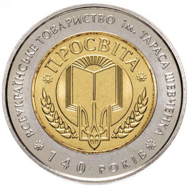 Описание: На монеті зображено емблему Всеукраїнського товариства «Просвіта» та напис по колу: ВСЕУКРАЇНСЬКЕ ТОВАРИСТВО ІМ. ТАРАСА ШЕВЧЕНКА - 140 РОКІВ (Всеукраїнське товариство імені Тараса Шевченка - 140 років).