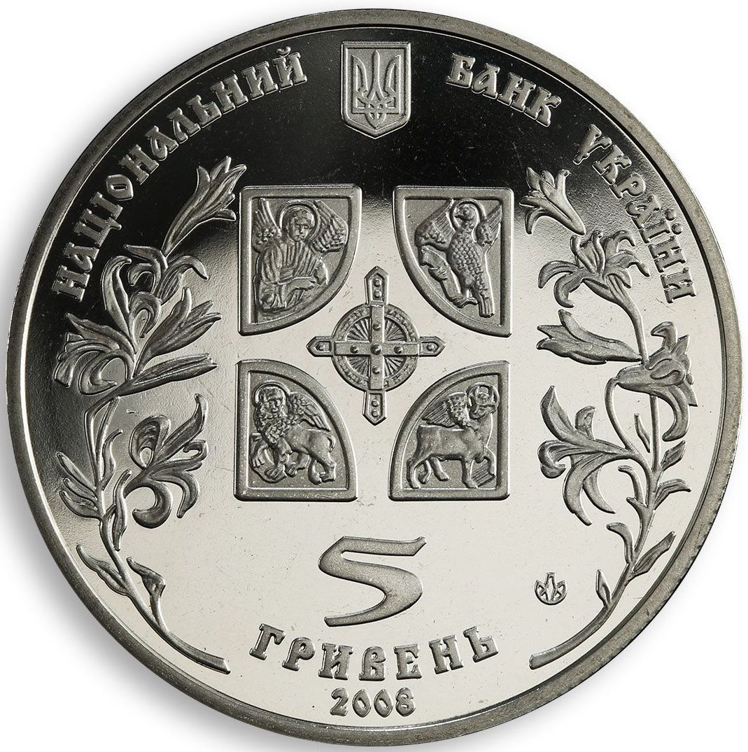 Описание: Зверху розміщено невеликий Державний герб України та напівкруглий напис — НАЦІОНАЛЬНИЙ БАНК УКРАЇНИ, у центрі — стилізоване зображення Євангелія, по обидва боки якого розміщено лілії, що асоціюються з Дівою Марією. Також розміщені написи: 5 ГРИВЕНЬ (5 гривень), 2008, рік випуску монети (знизу) та логотип Монетного двору Національного банку України.