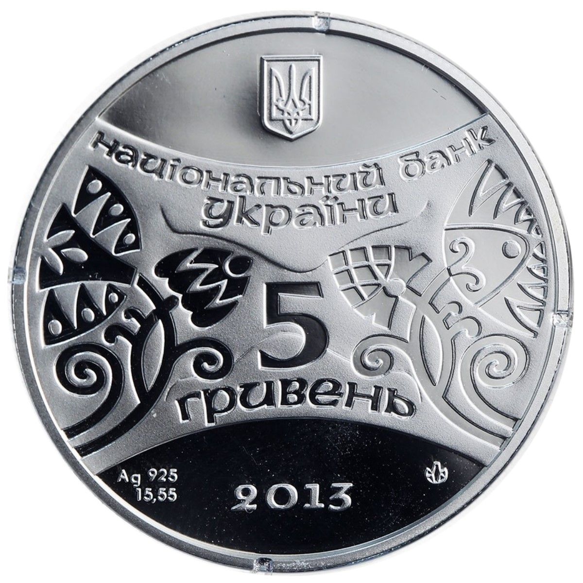 Описание: Зверху розміщено малий герб України з написом НАЦІОНАЛЬНИЙ БАНК/ УКРАЇНИ (Національний банк / України) під ним; у стилізованому рослинному орнаменті розміщено номінал 5/ ГРИВЕНЬ (5/гривень); внизу – рік випуску монети 2013, а також позначення металу та його проби Ag 925, вага монети в пробі 15,55 г та знак Монетного двору Національного банку України.