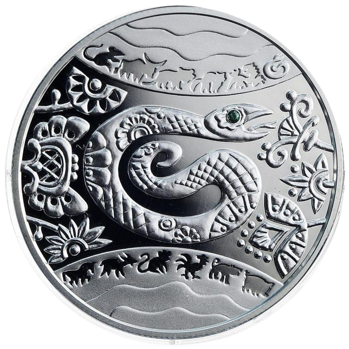 Описание: У рамках традиційного рослинного орнаменту зображено змію, виконану в техніці дешевого популярного друку (око змії представлено зеленим кубічним цирконієм). Як над, так і під цією композицією зображено контурні фігури всіх 12 символів східного календаря.