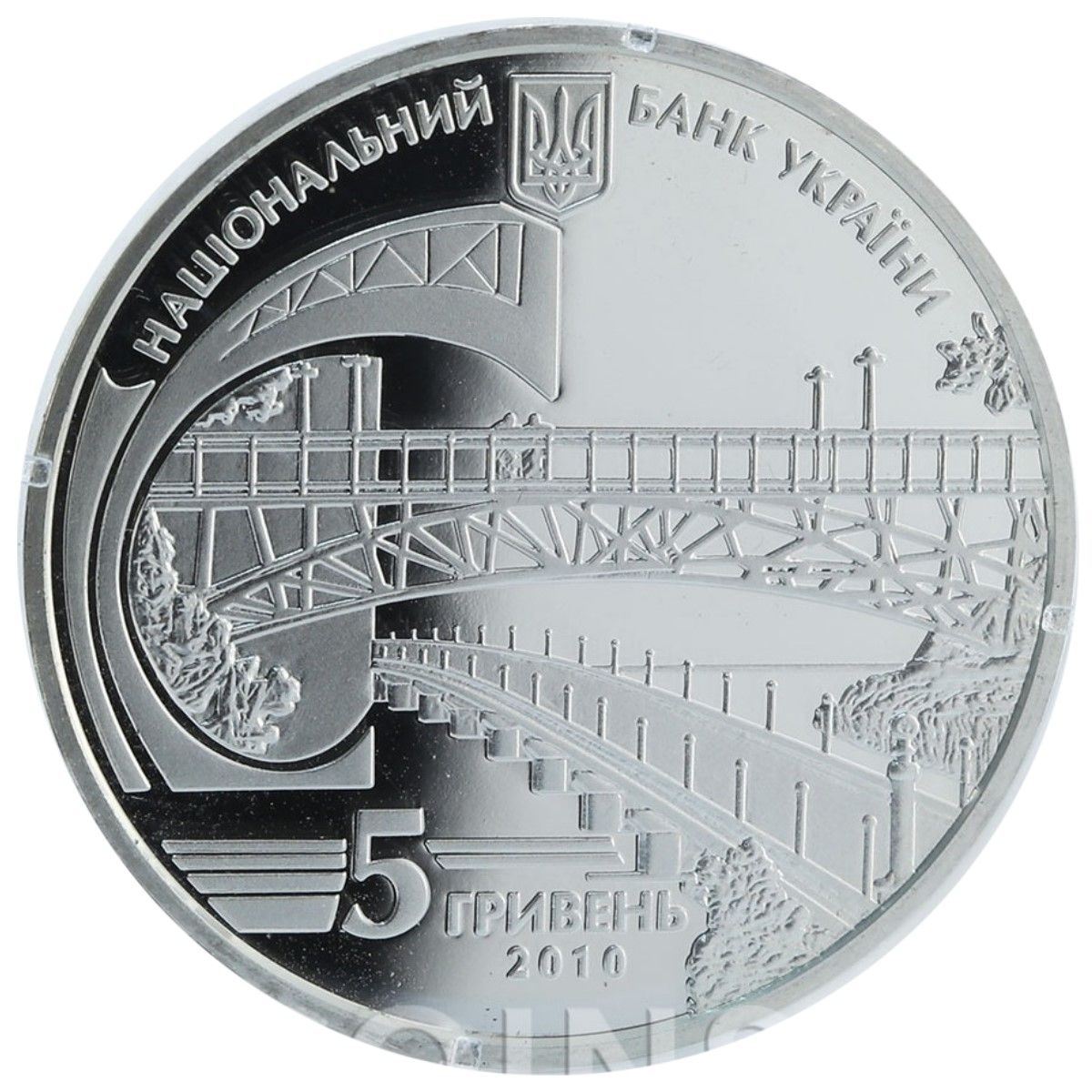 Описание: Зверху розміщений малий герб України з напівкруглим написом НАЦІОНАЛЬНИЙ БАНК УКРАЇНИ (Національний банк України); внизу — композиція, що символізує діяльність вченого в галузі мостобудування, яка представляє Патонів міст, перший повністю зварний міст в Європі, пішохідний міст через Петровську алею та стилізований аркуш паперу Whatman (зліва); нижче — напис 5 ГРИВЕНЬ/2010 (5 гривень).