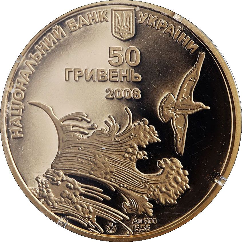 Описание: На монеті зображено морську хвилю та чайку, зверху — невеликий герб України та напівкруглий напис: НАЦІОНАЛЬНИЙ БАНК УКРАЇНИ (Національний банк України) та такі написи: 50/ ГРИВЕНЬ/ 2008 (50/ Гривня/ 2008), а також позначення металу Au 900 та його вага в пробі -15,55.