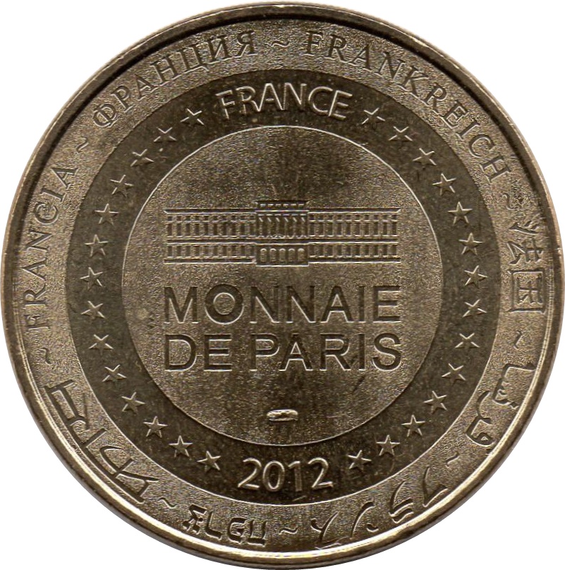 Описание: На периферії слово «Франція» написано вісьмома мовами. Франція на 12-й годині, 2012 рік на 6-й годині, все пов'язане 14 зірками праворуч і ліворуч. У центрі — будівля Монетного двору Парижа.