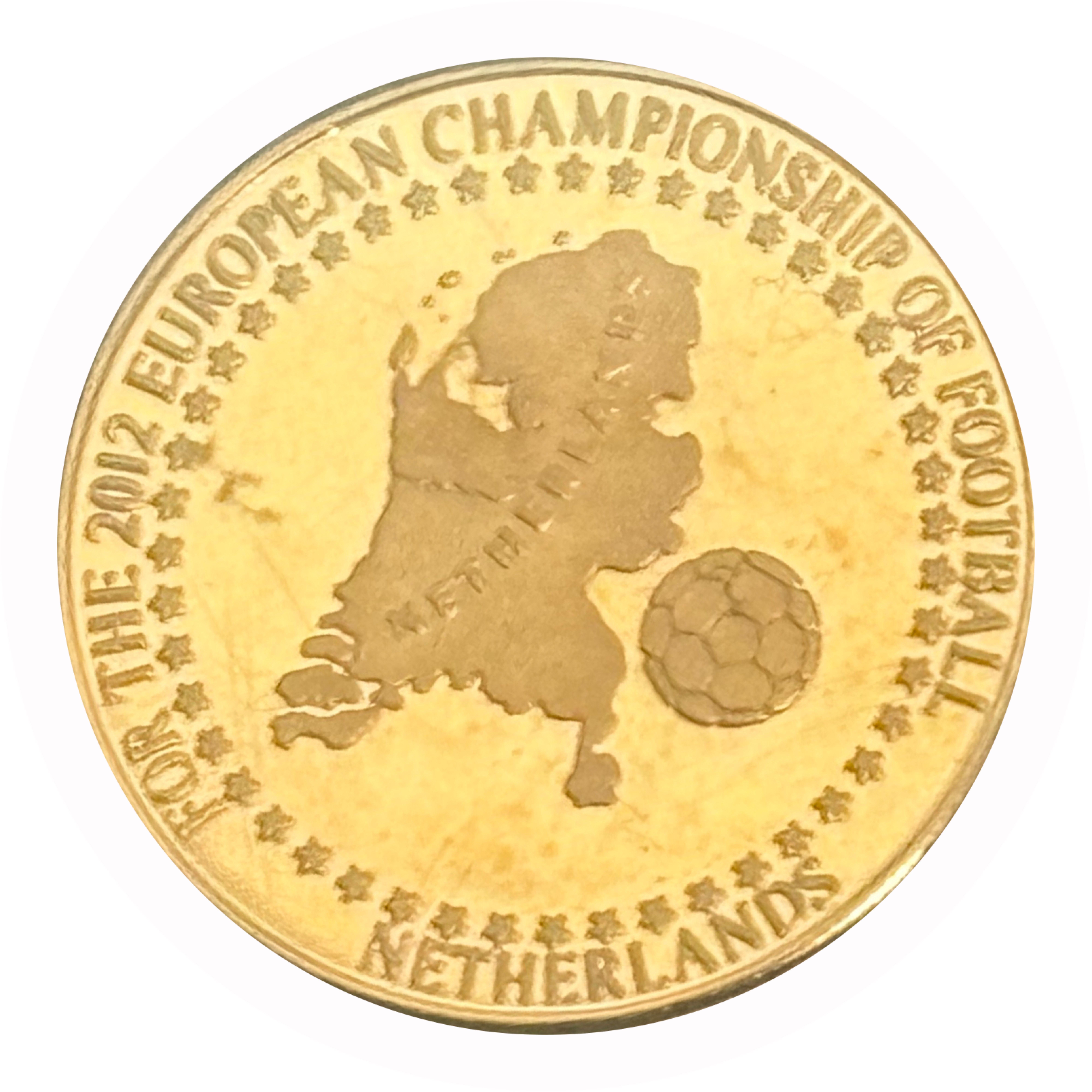 Описание: ДЛЯ ЧЕМПІОНАТУ ЄВРОПИ З ФУТБОЛУ 2012 РОКУ Показано силует карти з написом «НІДЕРЛАНДИ». Також показано футбольний м'яч, оточений кільцем із зірок.