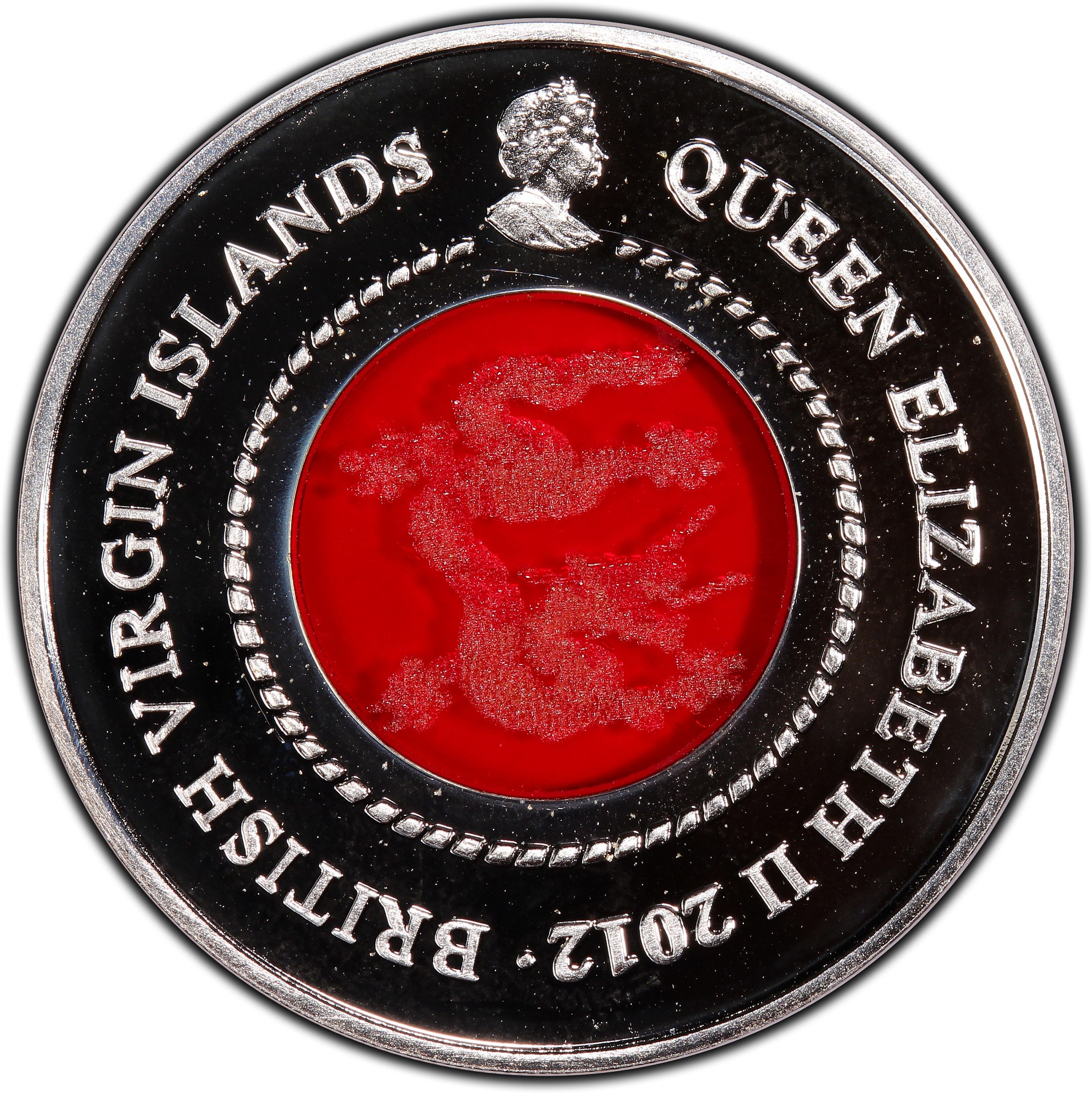 Описание: На аверсе над кристаллом изображен небольшой портрет королевы Елизаветы II, а ее имя и год изгибаются по правой стороне монеты. Надпись «BRITISH VIRGIN ISLANDS» изгибается по левой стороне монеты.