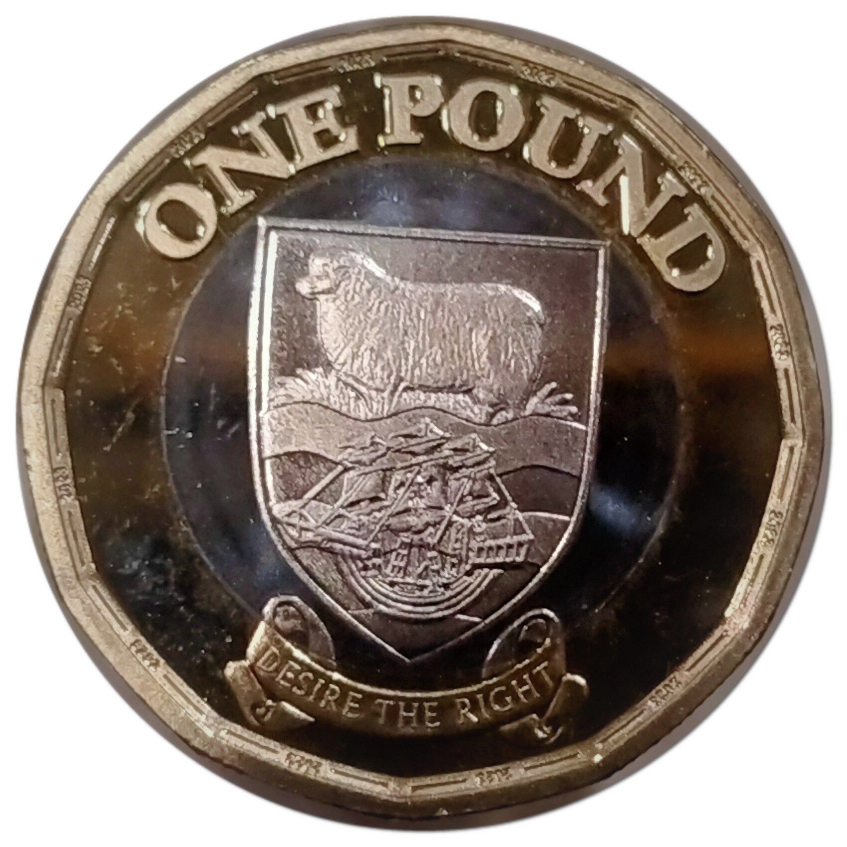 Описание: Портрет короля Карла III без короны, обращенный влево; клеймо монетного двора PM (монетный двор Побджой). Дата, имя правителя и надпись «British Overseas Territory» ↻ по кругу, скрытое изображение внизу 1 и £ (1 фунт). Номинал в виде микронадписи по краю, двенадцать раз, двойной мелкий текст с указанием номинала.