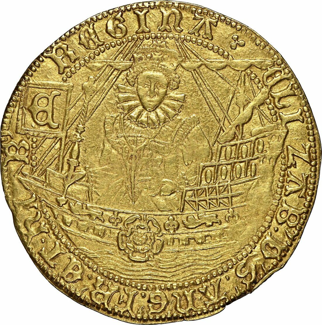 Описание: Королева, держащая державу и скипетр, сидящая в профиль на галеоне эпохи Тюдоров, украшенном двойной розой, орнаментами -1 | 1-1, канатами 3/3, парусами 2/4, буквой E на штанде и парусами на бушприте, под ними плещутся спокойные воды.
