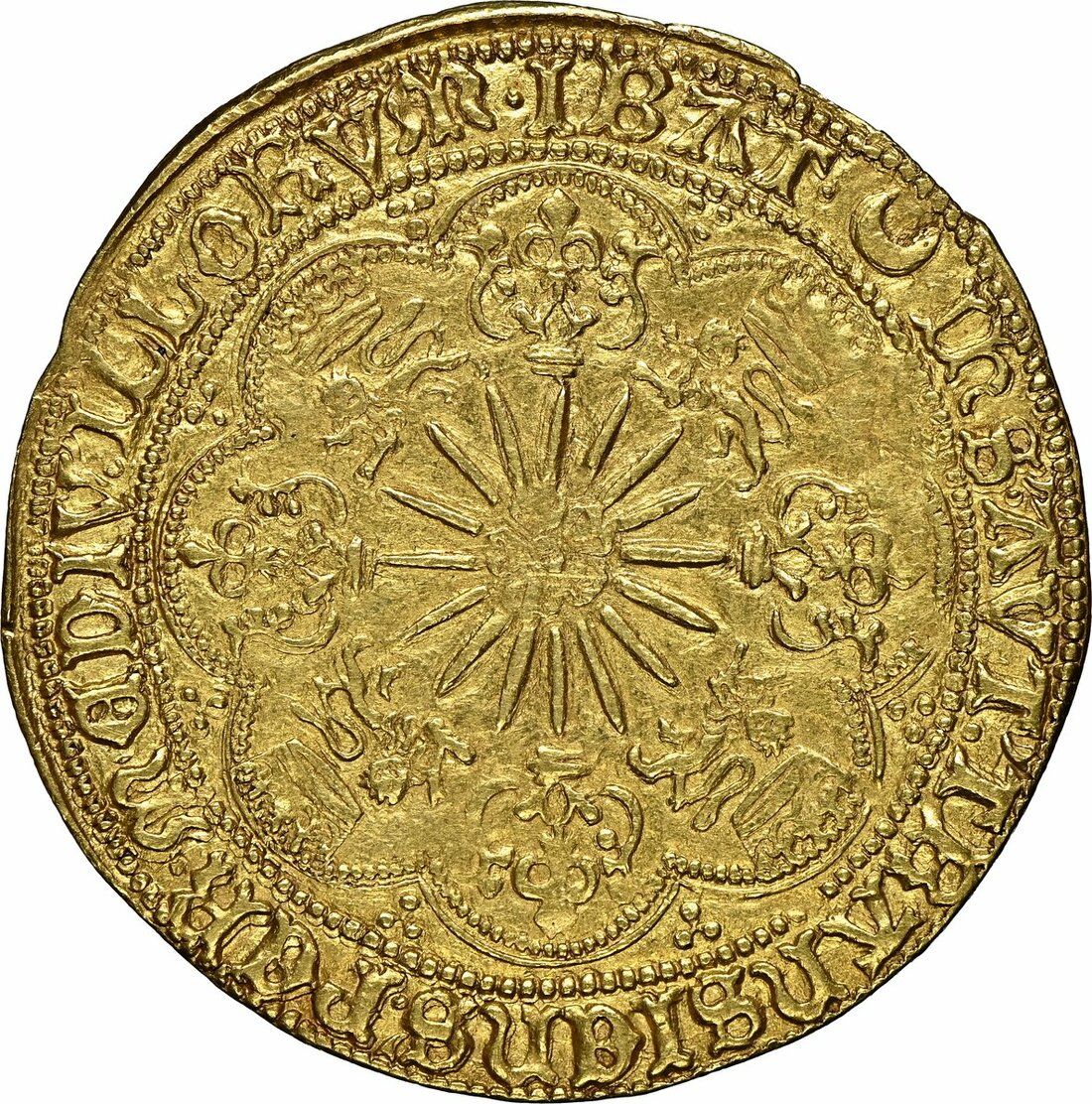 Описание: Роза на фоне сияющего солнца, чередующиеся увенчанные леопарды и цветочные крестообразные завершения по углам, небольшие трилистники в тимпанах