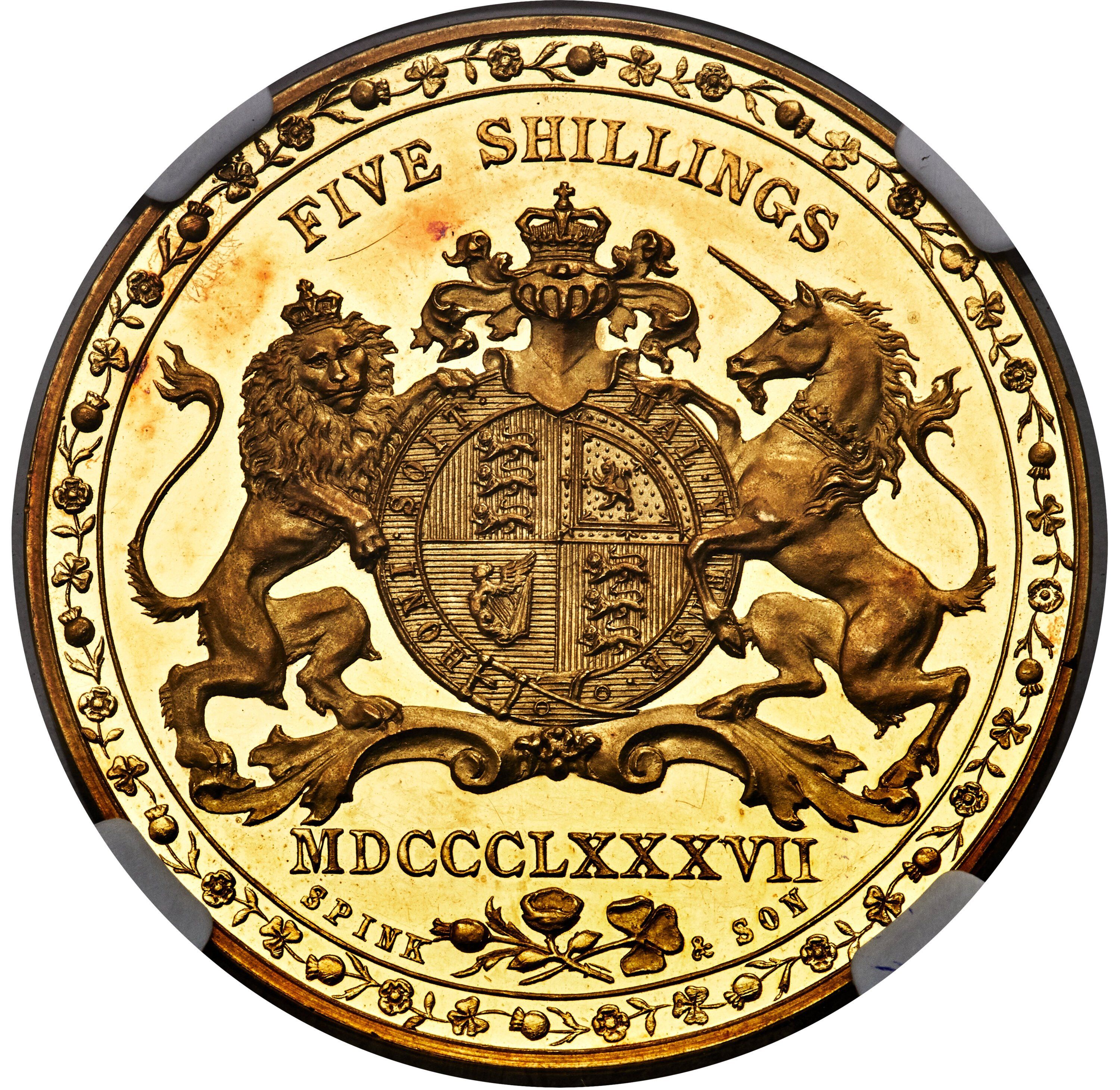 Описание: Королівський герб з підтримачами, MDCCCLXXXVII та гілками нижче.