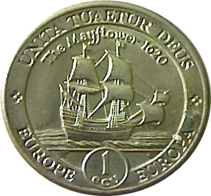 Описание: Корабель «Мейфлауер» у центральному колі, з написом зверху. Напис зовні кола зверху та знизу, з квіткою по обидва боки. Номінал у маленькому колі знизу.