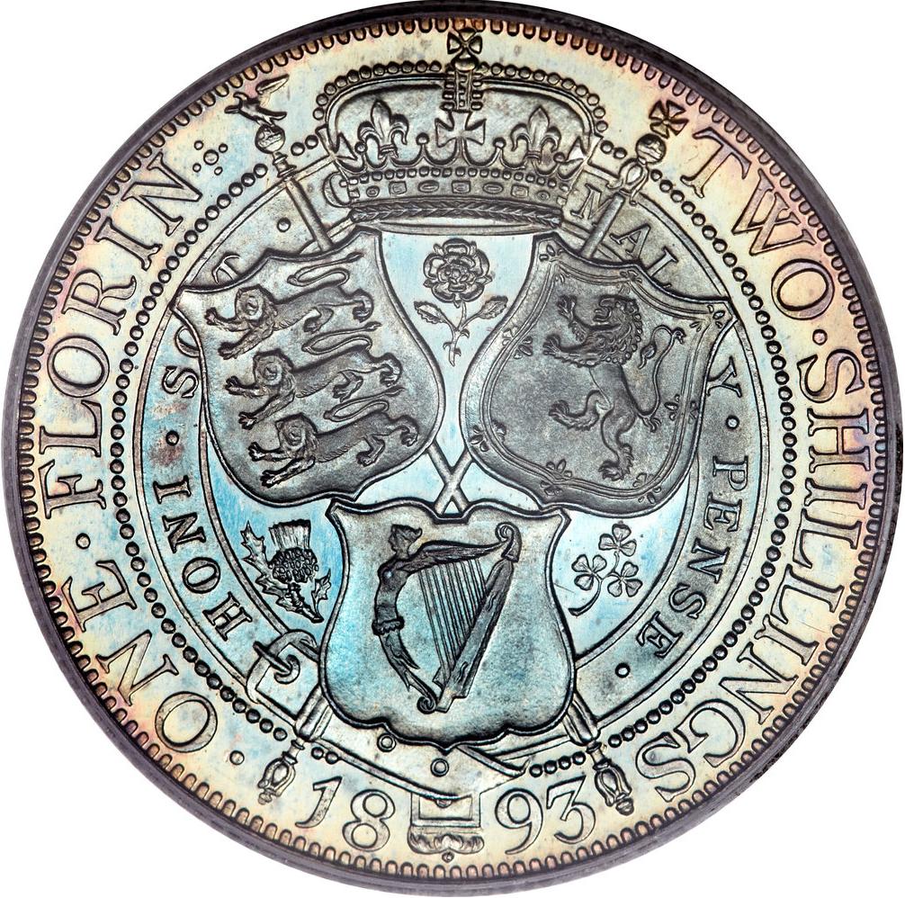 Описание: Корона над щитами Англии, Шотландии и Ирландии с эмблемами национальных цветов между ними, все в рамках ордена Подвязки с разделенной датой внизу и надписью вокруг.