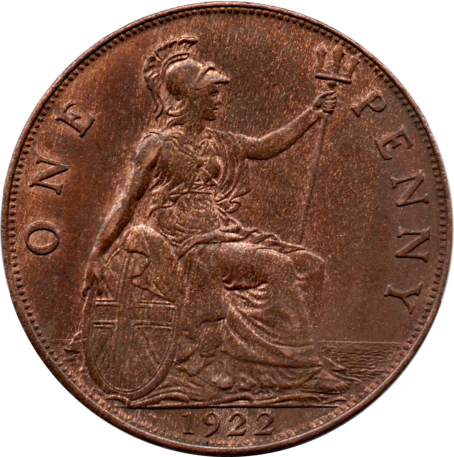 Описание: Сидящая фигура Британии справа, с трезубцем в левой руке и щитом с флагом Союза в правой, море позади, номинал сверху и дата в нижней части.
