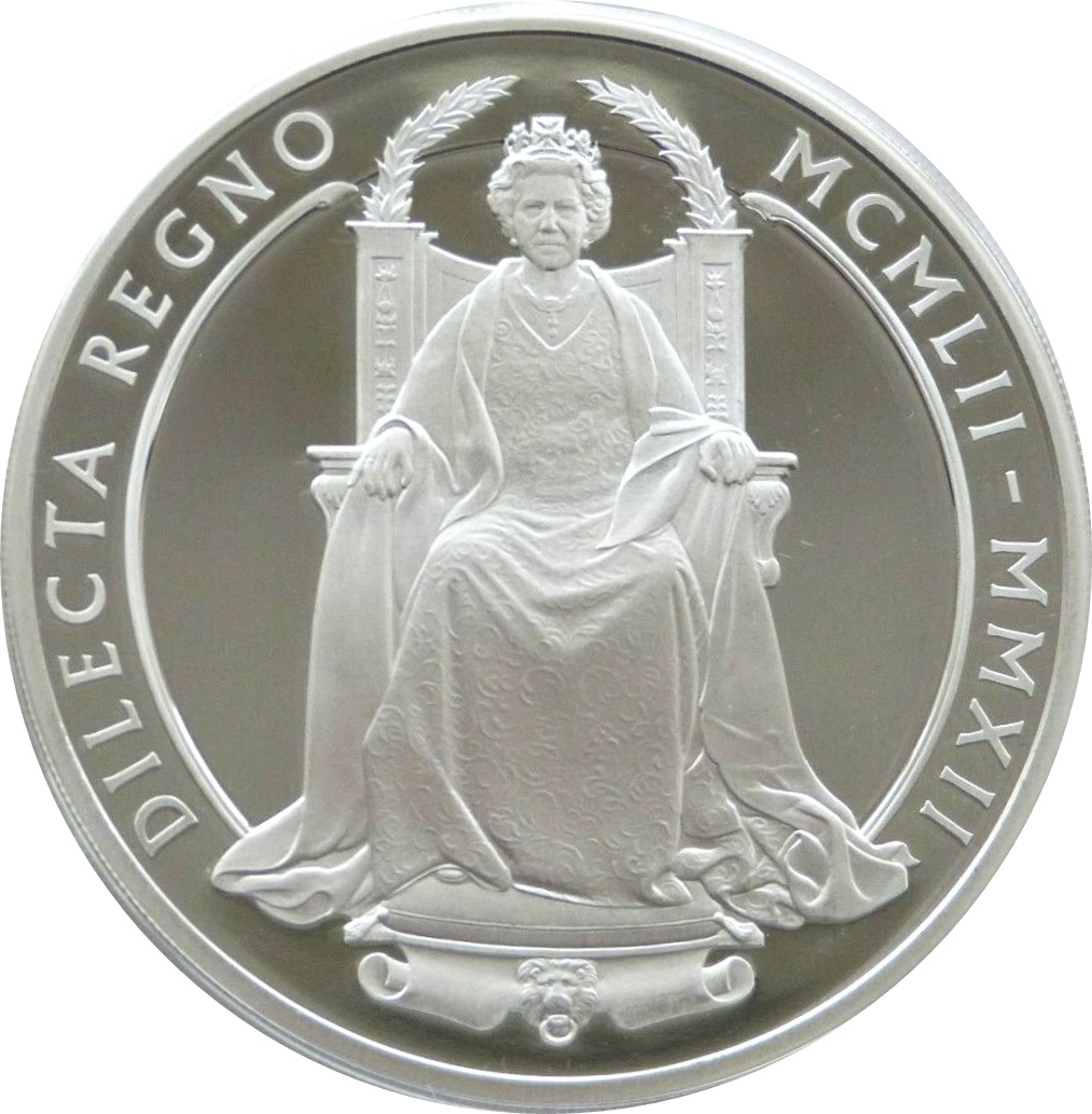Описание: На лицьовій стороні зображено портрет королеви Єлизавети II в короні, сидячої на троні, з написом та датами навколо.