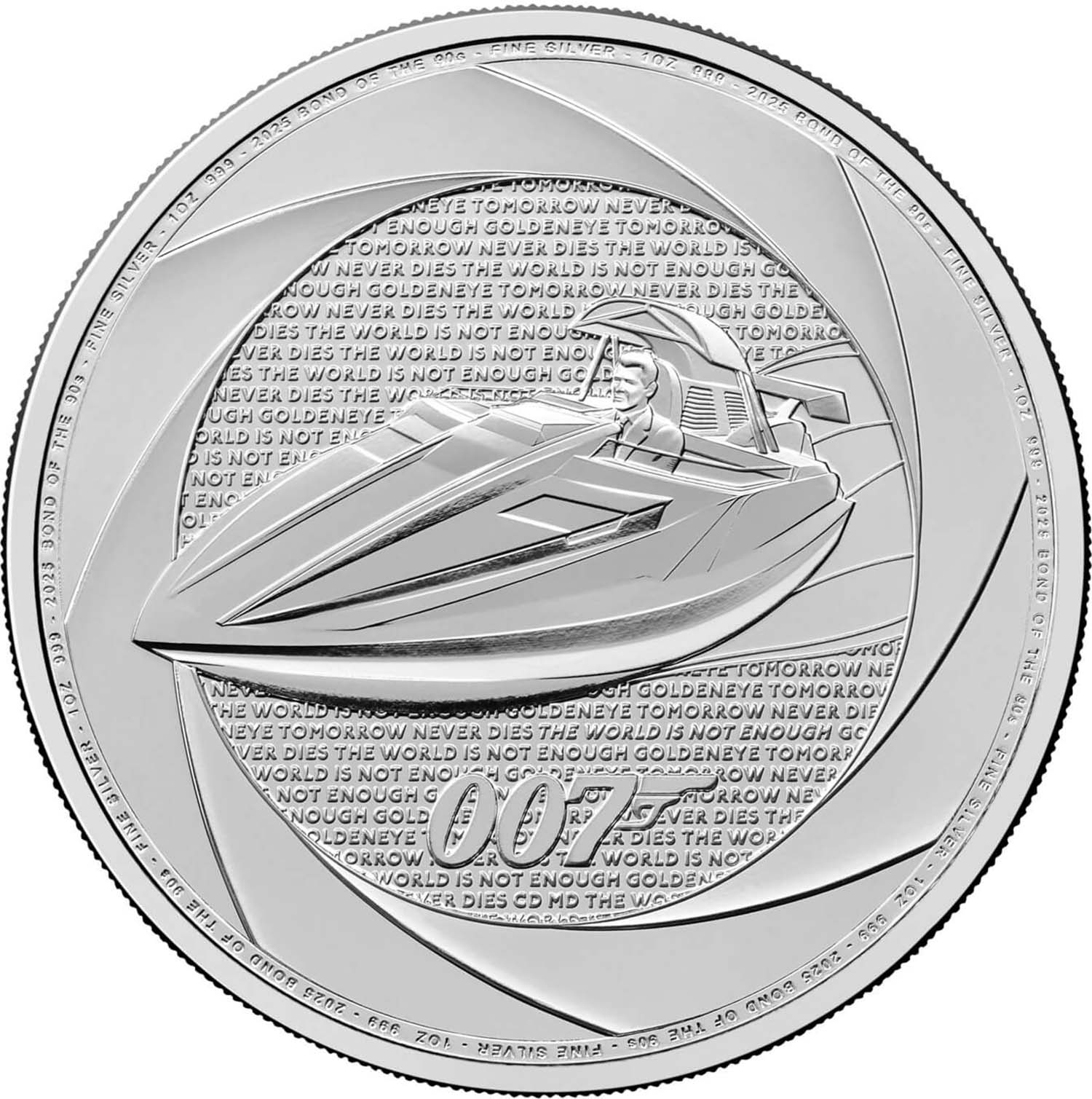 Описание: Изображение скоростного катера Q-Branch из фильма «Мир не достаточно», на фоне титров фильмов о Джеймсе Бонде 1990-х годов и надписи «007».