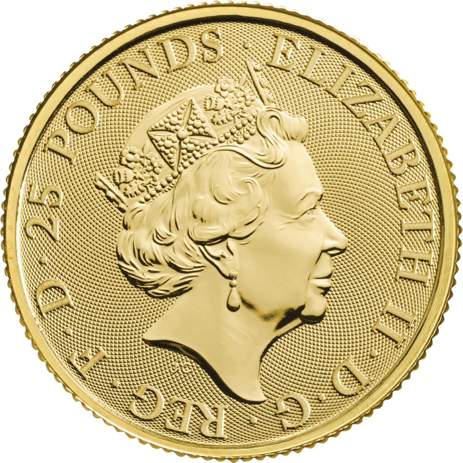 Название: 25 фунтів — Єлизавета II (Білий лев Мортімера; 1/4 унції чистого золота)
