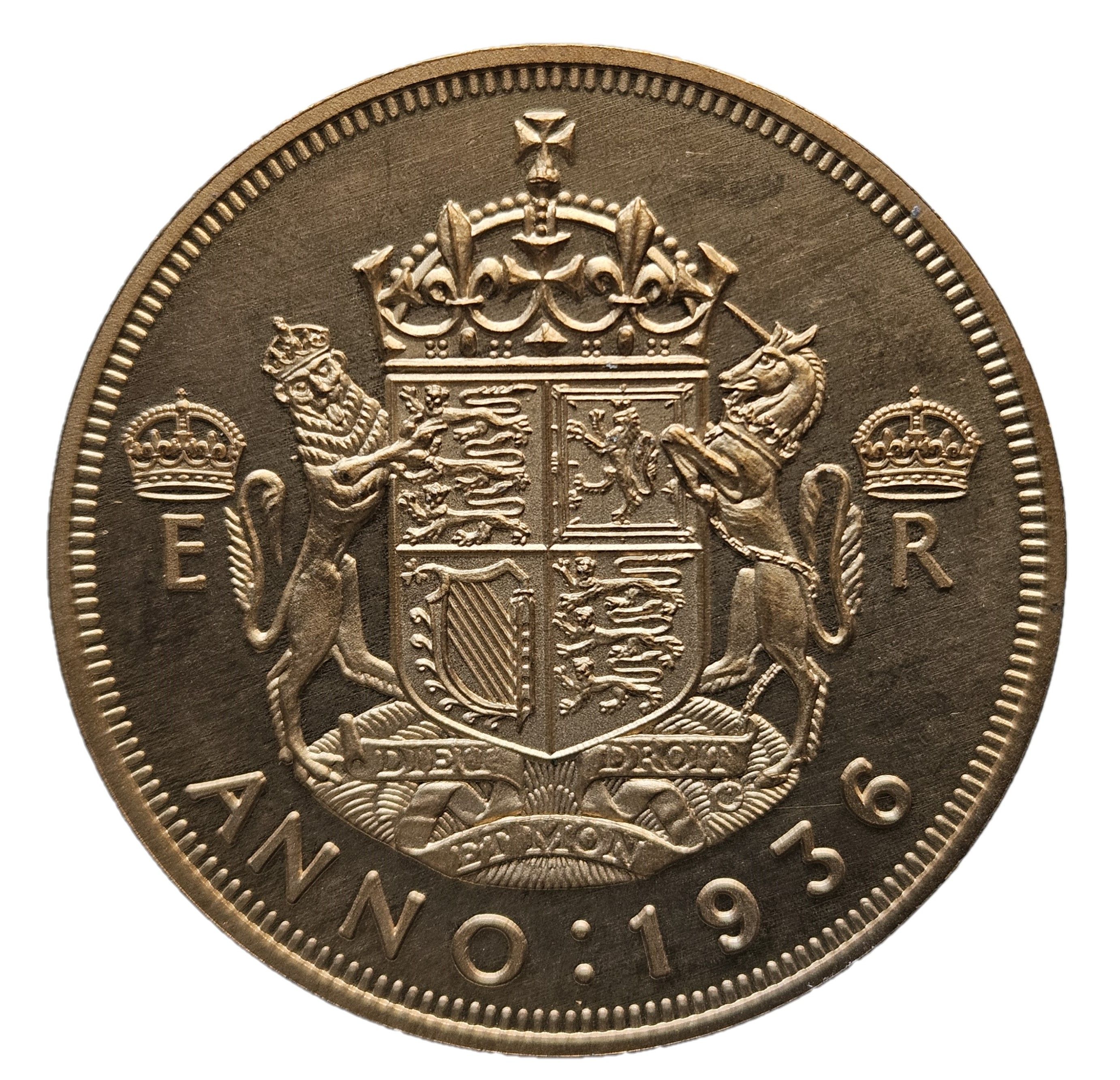 Описание: Коронований гербовий щит із левом та єдинорогом, прапор на землі внизу, коронована літера E ліворуч, коронована літера R праворуч. ПОВНИЙ ПРОСТІР ВГОРІ. Anno:1936 внизу