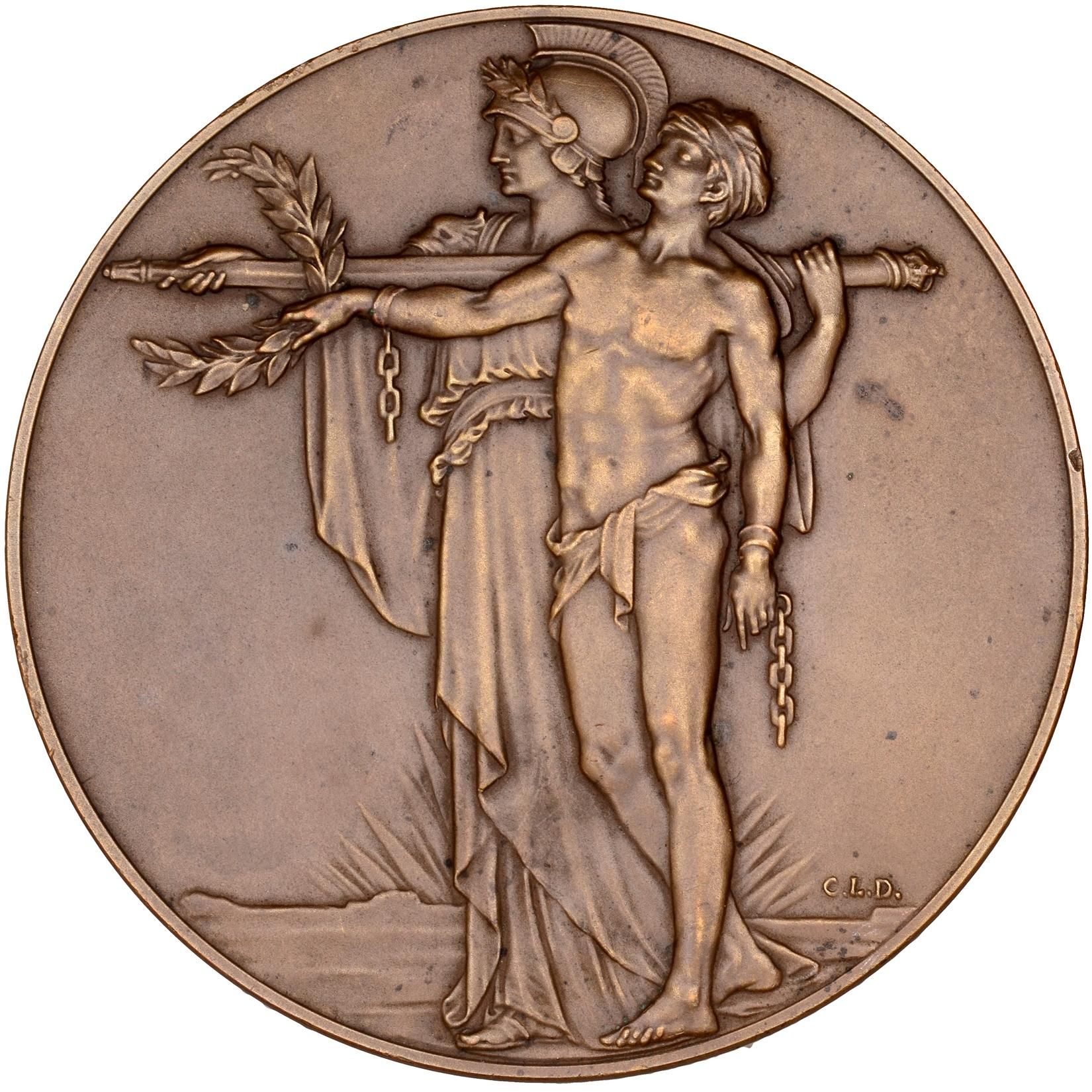 Описание: Дві фігури (ліворуч) одягнені в класичному стилі. Чоловік попереду в набедреній пов'язці та тюрбані, його зап'ястя скуті кайданами, ланцюги яких розірвані. Його права рука витягнута, тримаючи лаврову гілку. За ним жінка в шоломі (Британія або Мир) тримає горизонтально булаву. Промені сонця видно за горизонтом за ними.