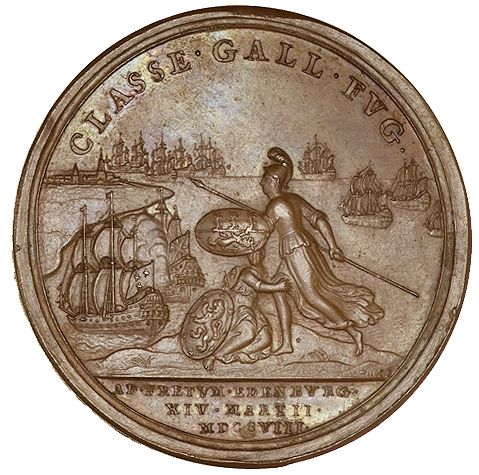 Описание: Британия, вооруженная, бежит и защищает Шотландию (притаившуюся у ее ног) от французского флота; этот флот, за исключением корабля «Солсбери», вступающего в бой с английским судном на переднем плане (слева), уходит вдали.