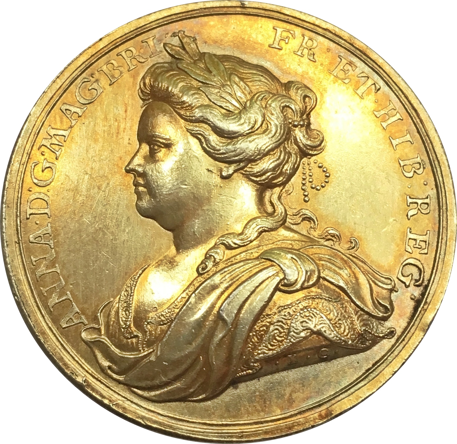Описание: Бюст королевы Анны, обращенный влево, в лавровом венке, волосы, переплетенные жемчугом, с локонами сзади и на левом плече, в вышитом платье и мантии, завязанной узлом на плече