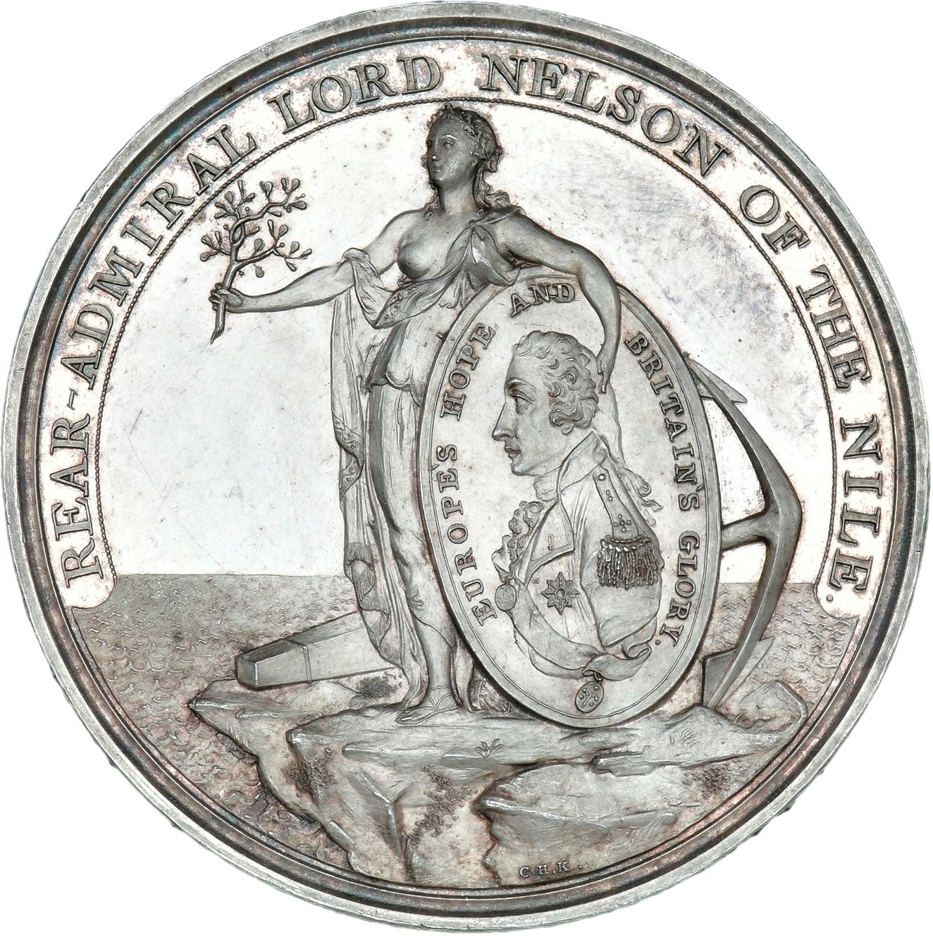 Описание: Мир, стоящий на скалистом берегу, держит в левой руке овальный медальон с бюстом лорда Нельсона