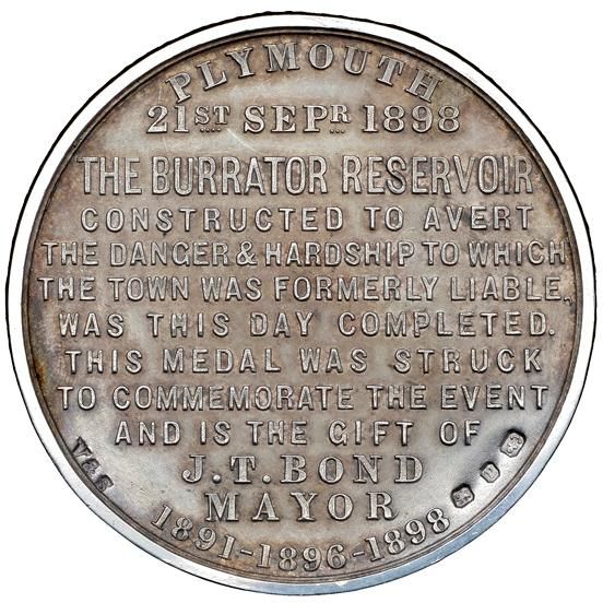 THE BURRATOR RESERVOIR CONSTRUCTED TO AVERT THE DANGER & HARDSHIP TO WHICH THE TOWN WAS FORMERLY LIABLE, WAS THIS DAY COMPLETED. THIS MEDAL WAS STRUCK TO COMMEMORATE THE EVENT AND IS THE GIFT OF