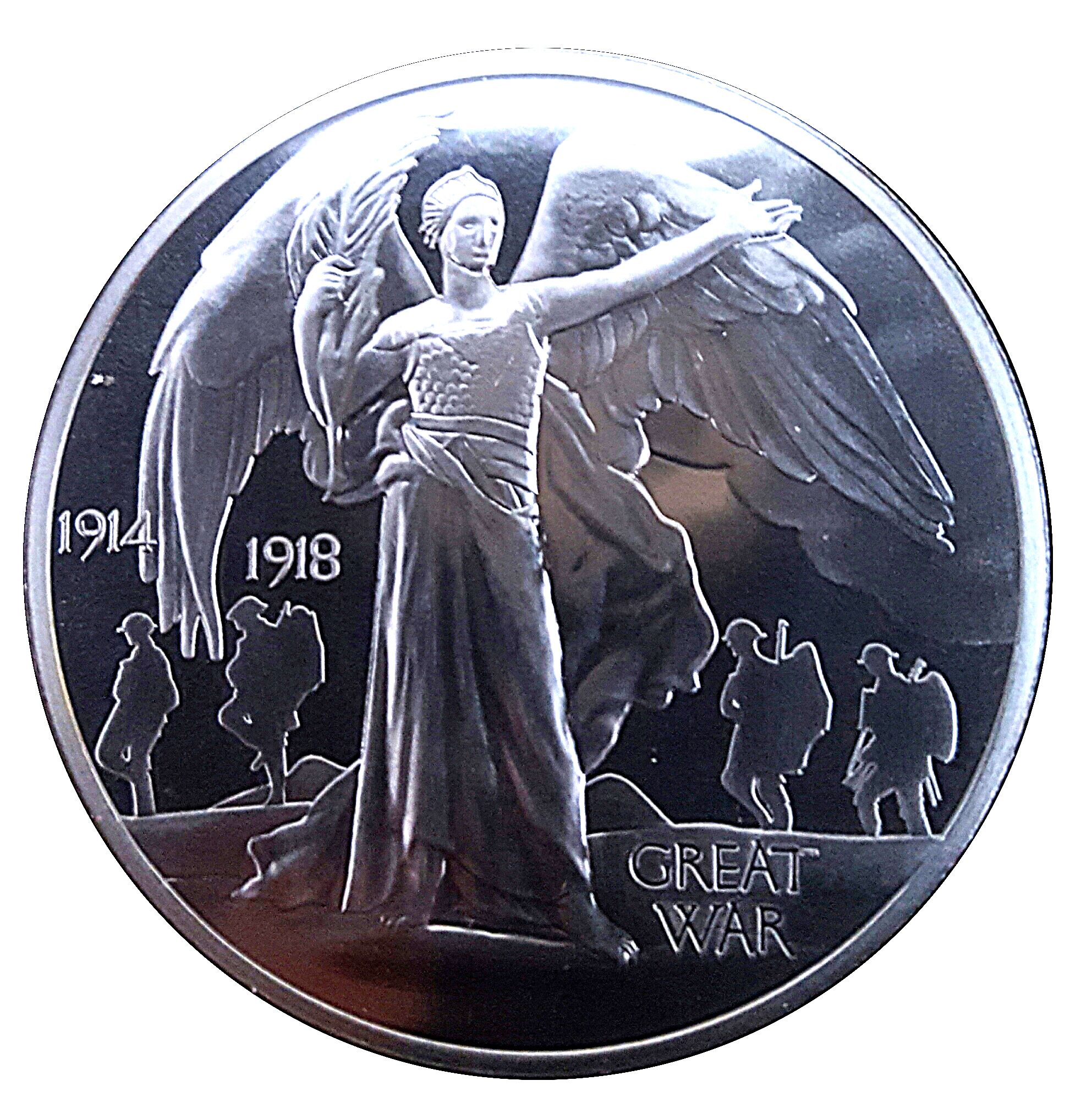 Описание: На передньому плані зображена крилата фігура Перемоги (Вікторії) у повний зріст, з витягнутою лівою рукою і пальмовою гілкою в правій руці. На задньому плані — велика хмара і четверо солдатів.