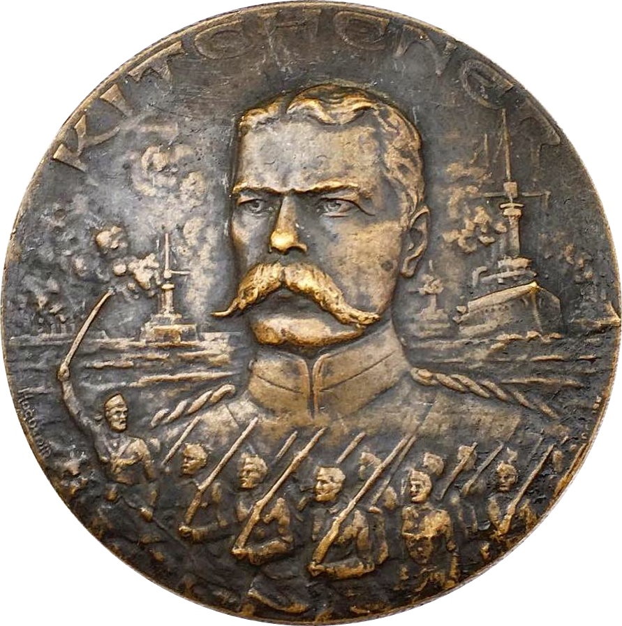 Описание: Бюст Кітченера в уніформі фельдмаршала, звернений на три чверті вправо, з оголеною головою; з обох боків на полі зображені військові кораблі, а внизу — солдати, яких підганяють вперед.