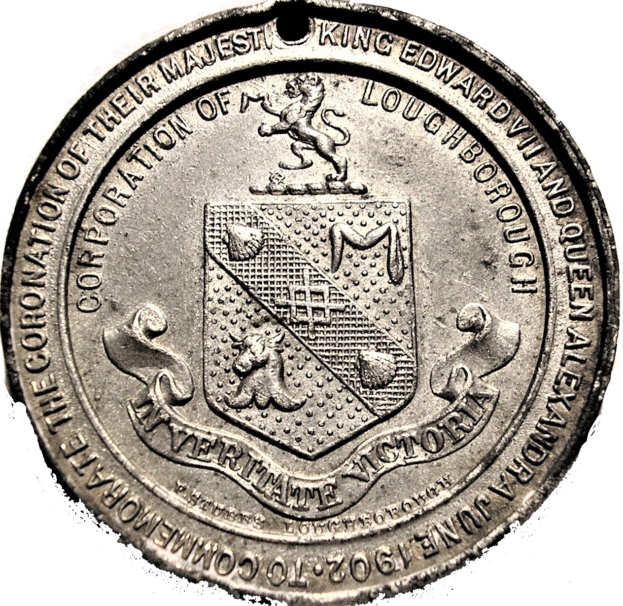 Описание: Герб Лафборо з девізом на банері. Напис у центрі та навколо. Ім'я гравера та місто-виробник під девізом.