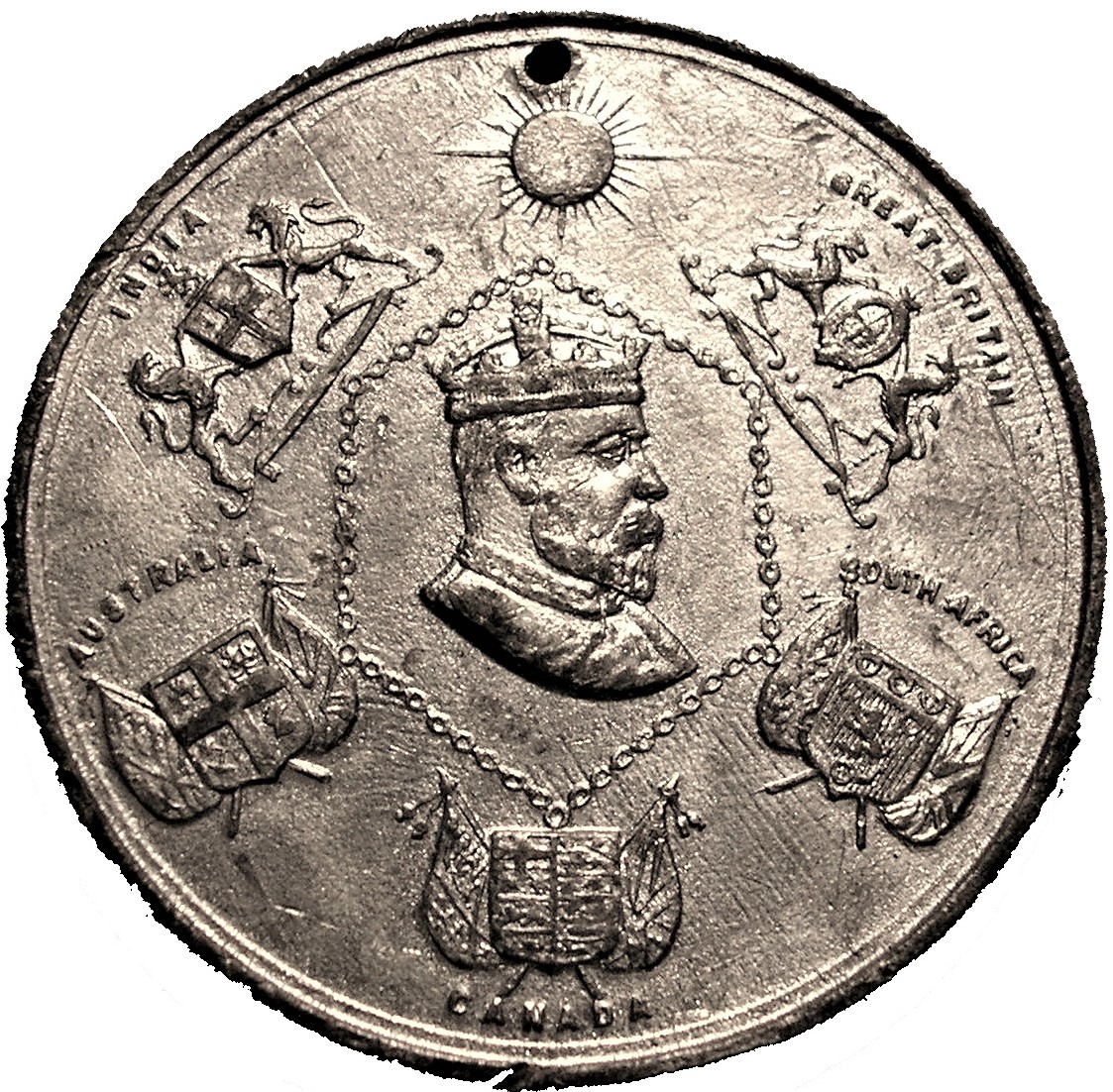Описание: У центрі поля зображено короновану голову короля Едуарда VII, звернену вправо, а навколо неї — золотий ланцюг, який символізує герби та назви домініонів Імперії. У верхній частині — сяюче сонце.