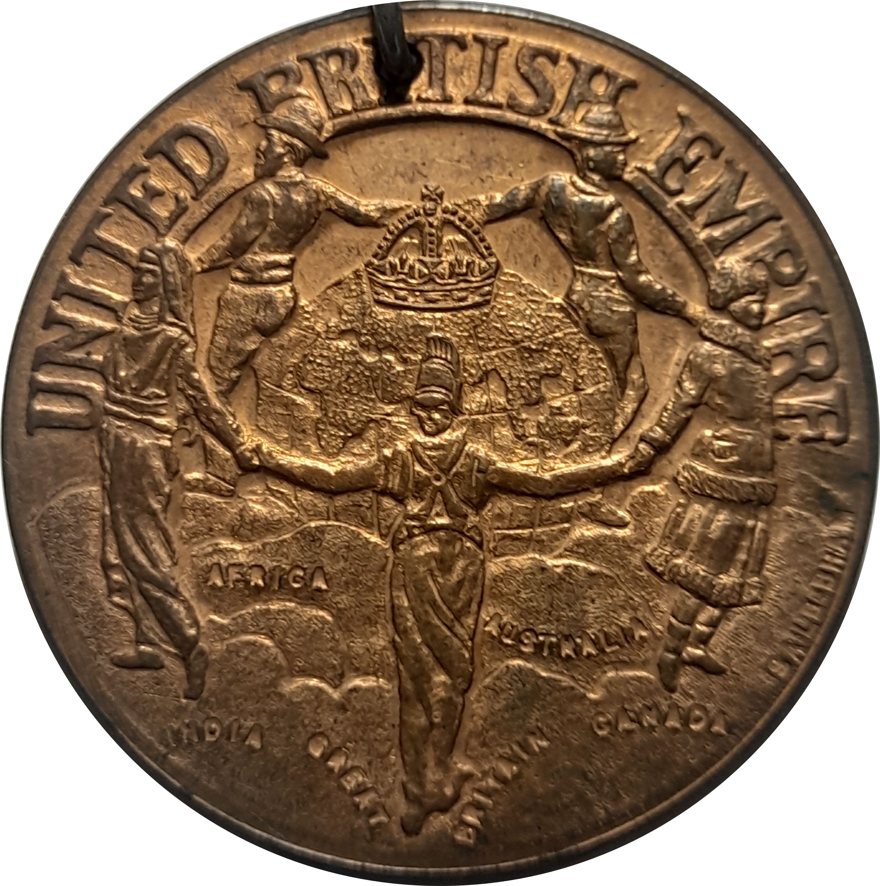 Описание: Британія та 4 фігури, що символізують Велику Британію та домініони, стоять обличчям назовні, тримаючись за руки, навколо коронованого глобуса, а під ними хмари з назвами територій. Інформація про виробника в правому полі.