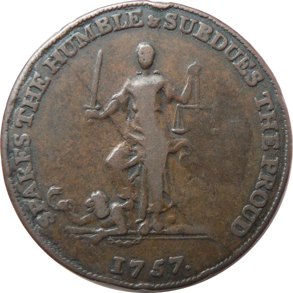 Описание: Богиня правосудия в мантии, стоящая лицом к зрителю (весы в поднятой левой руке, меч в поднятой правой руке), попирающая Разногласие (держащее аспида и носящее цепь с гирей) на земле внизу. В экзерге — дата. Надпись по краю. Зубчатая кайма