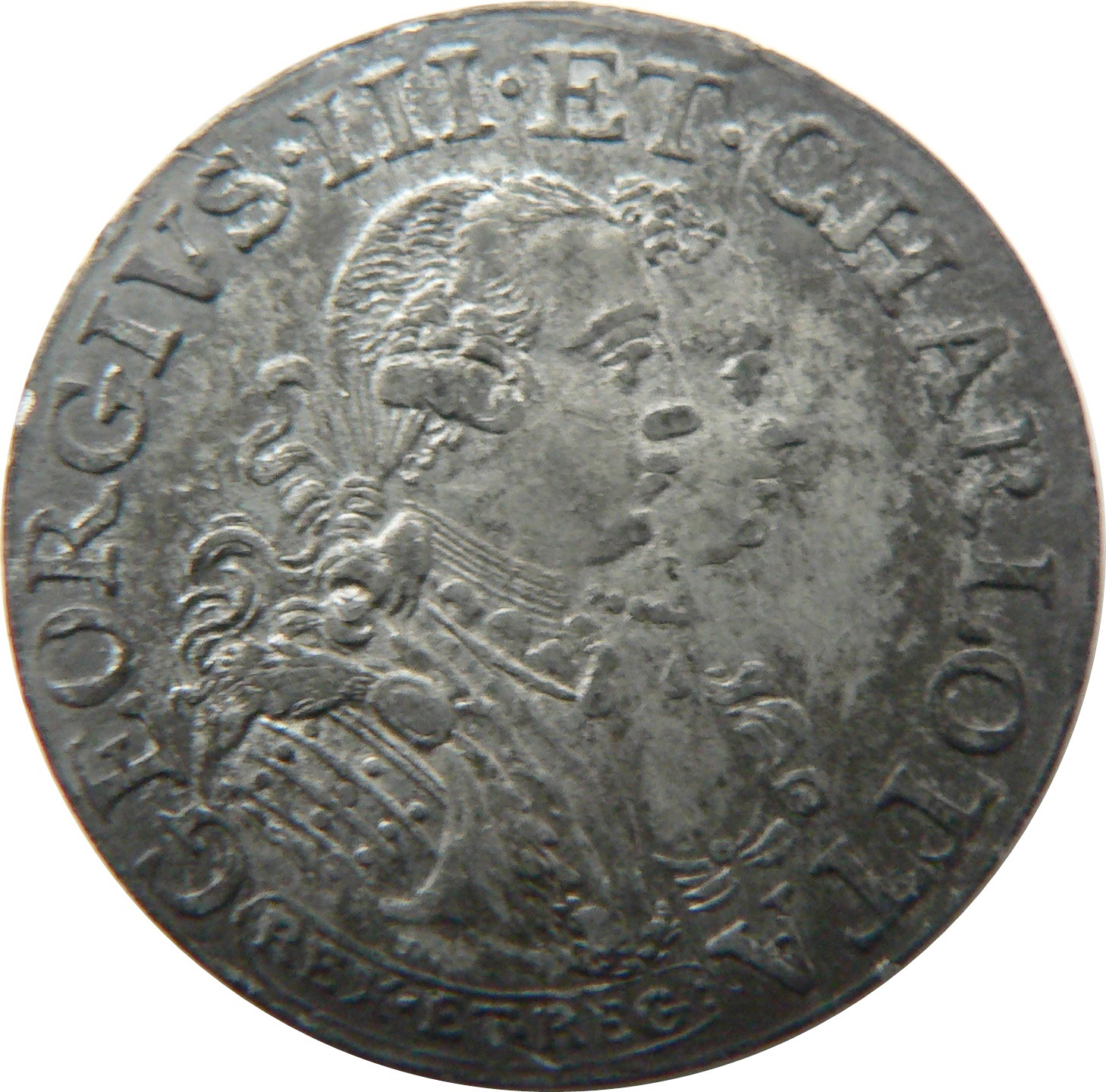 Описание: Соединенные бюсты без короны Георга III и королевы Шарлотты, обращенные вправо. Надпись вокруг