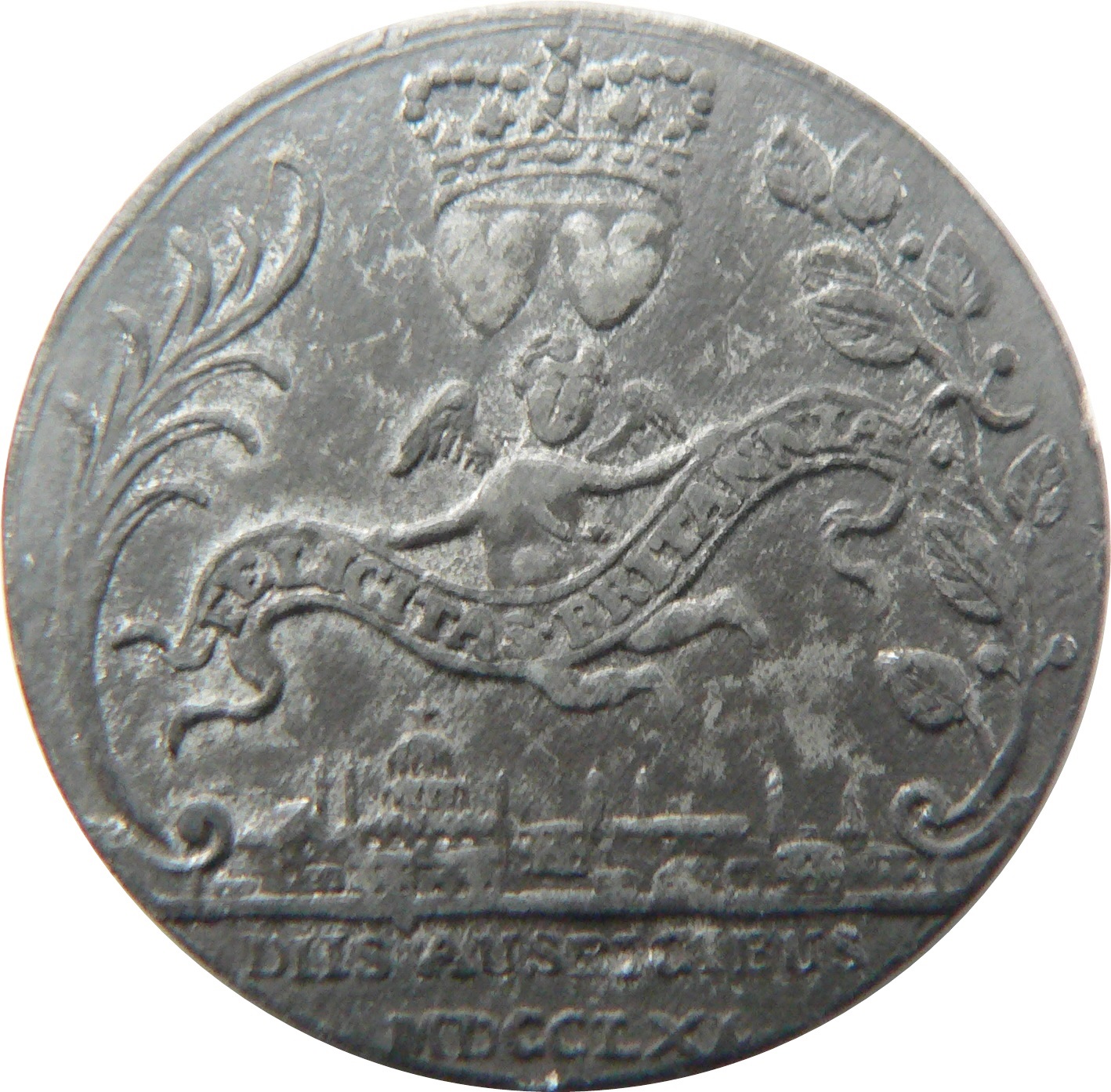 Описание: Вид на Лондон в сторону северного берега Темзы с собором Святого Павла; позади — путти (летящий крылатый херувим), держащий свиток с надписью, над которым расположены соединенные сердца с коронами. Надпись и дата римскими цифрами в эксерге