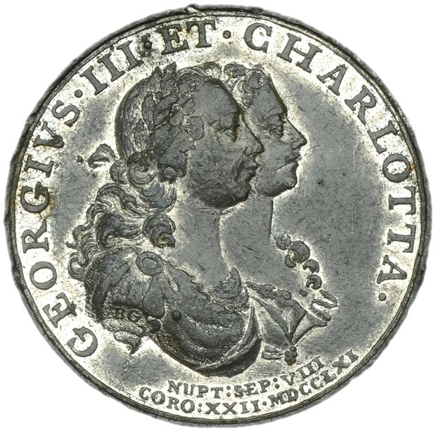 Описание: Соединенные драпированные бюсты Георга III и королевы Шарлотты справа