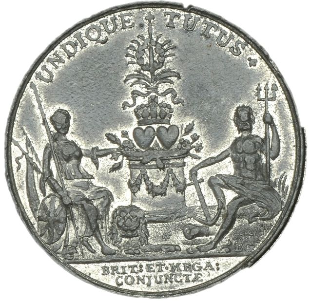 Описание: Британия и Нептун сидят по обе стороны от пьедестала, на котором находятся два сердца, увенчанные короной и копьем с орнаментом