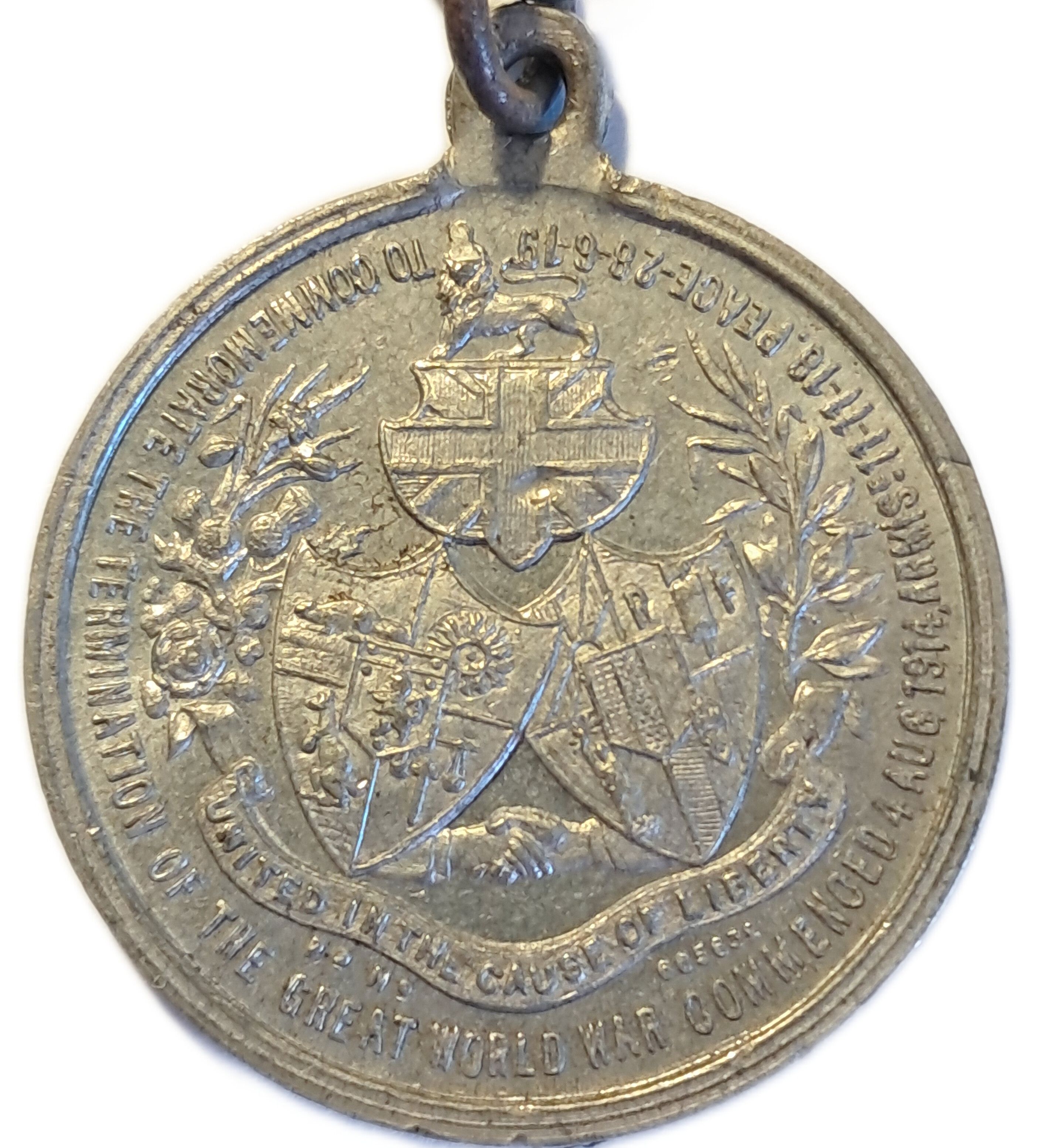 TO COMMEMORATE THE TERMINATION OF THE GREAT WORLD WAR COMMENCED 4 AUG' 1914, ARMSE. 11-11-18, PEACE 28-6-19