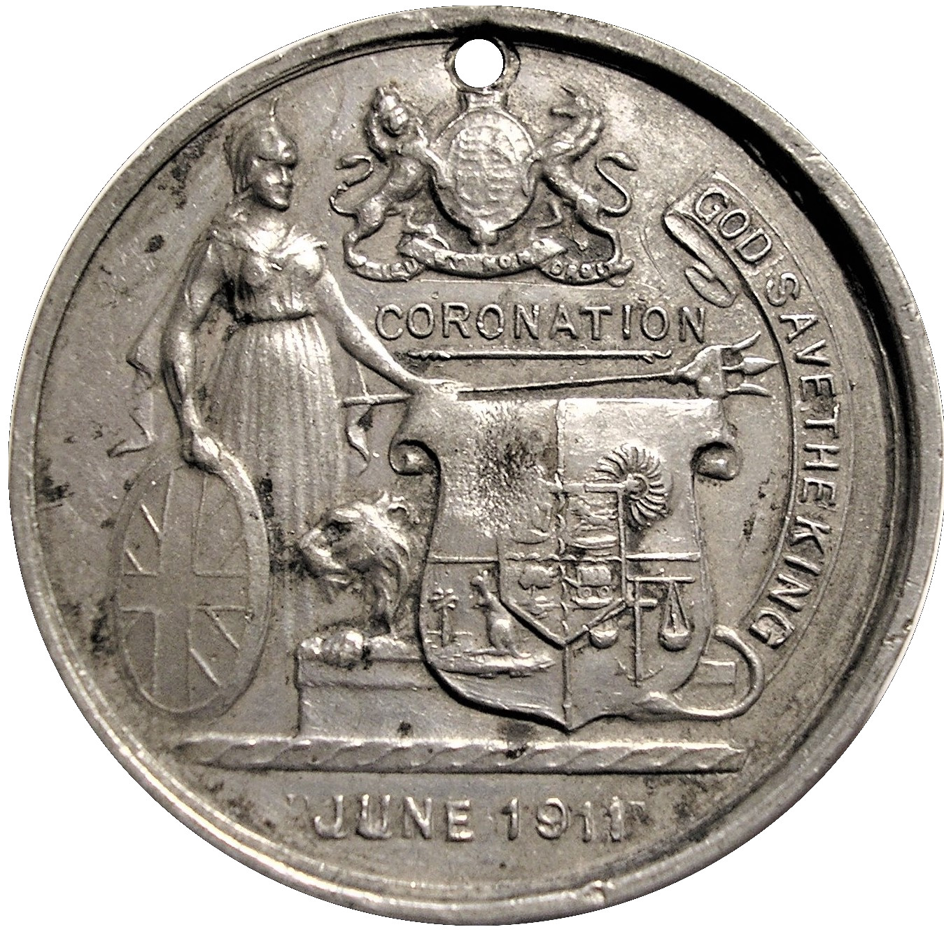 Описание: На правому краю монети викарбувано напис «GOD SAVE THE KING» (Боже, бережи короля), а внизу — «JUNE 1911» (червень 1911 року), місяць і рік коронації нового короля.