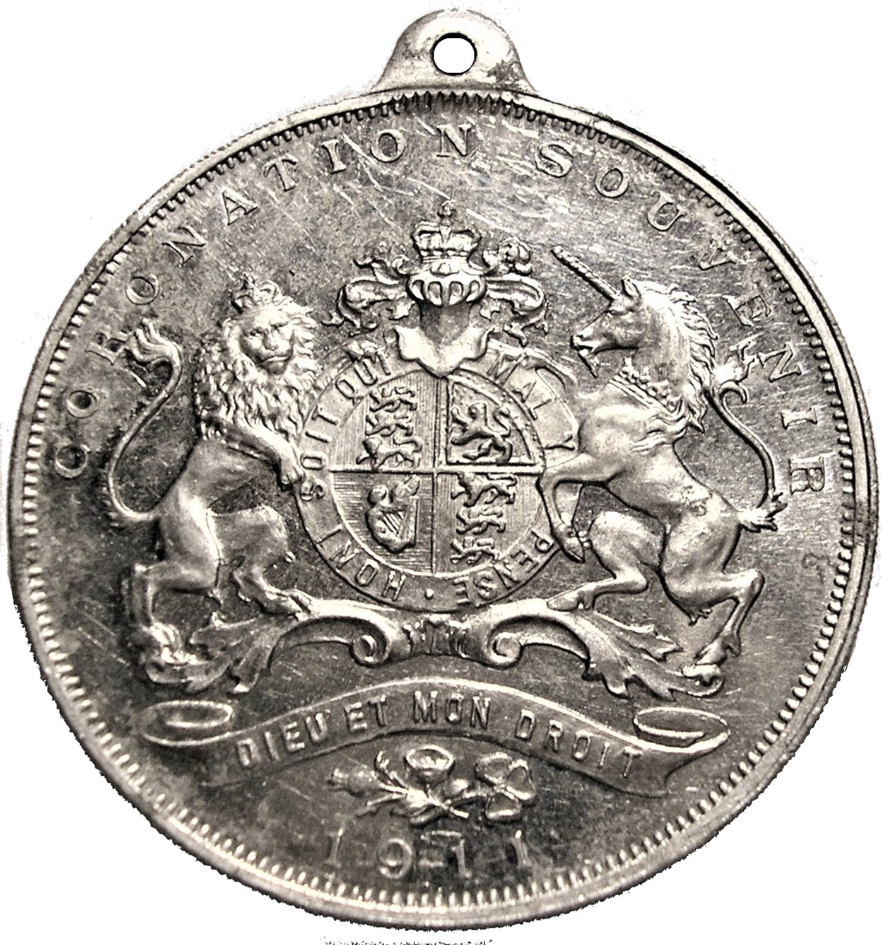 Описание: Коронований герб Сполученого Королівства з девізами, написом у верхній частині та датою в нижній частині, під британським квітковим знаком.
