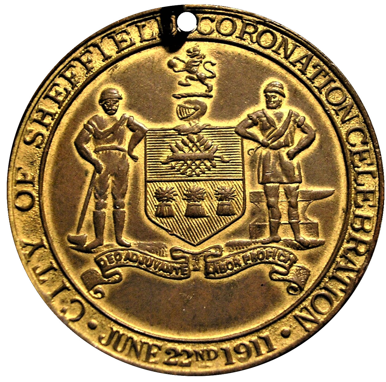 Описание: Герб і девіз міста Шеффілд. Напис навколо і дата внизу.