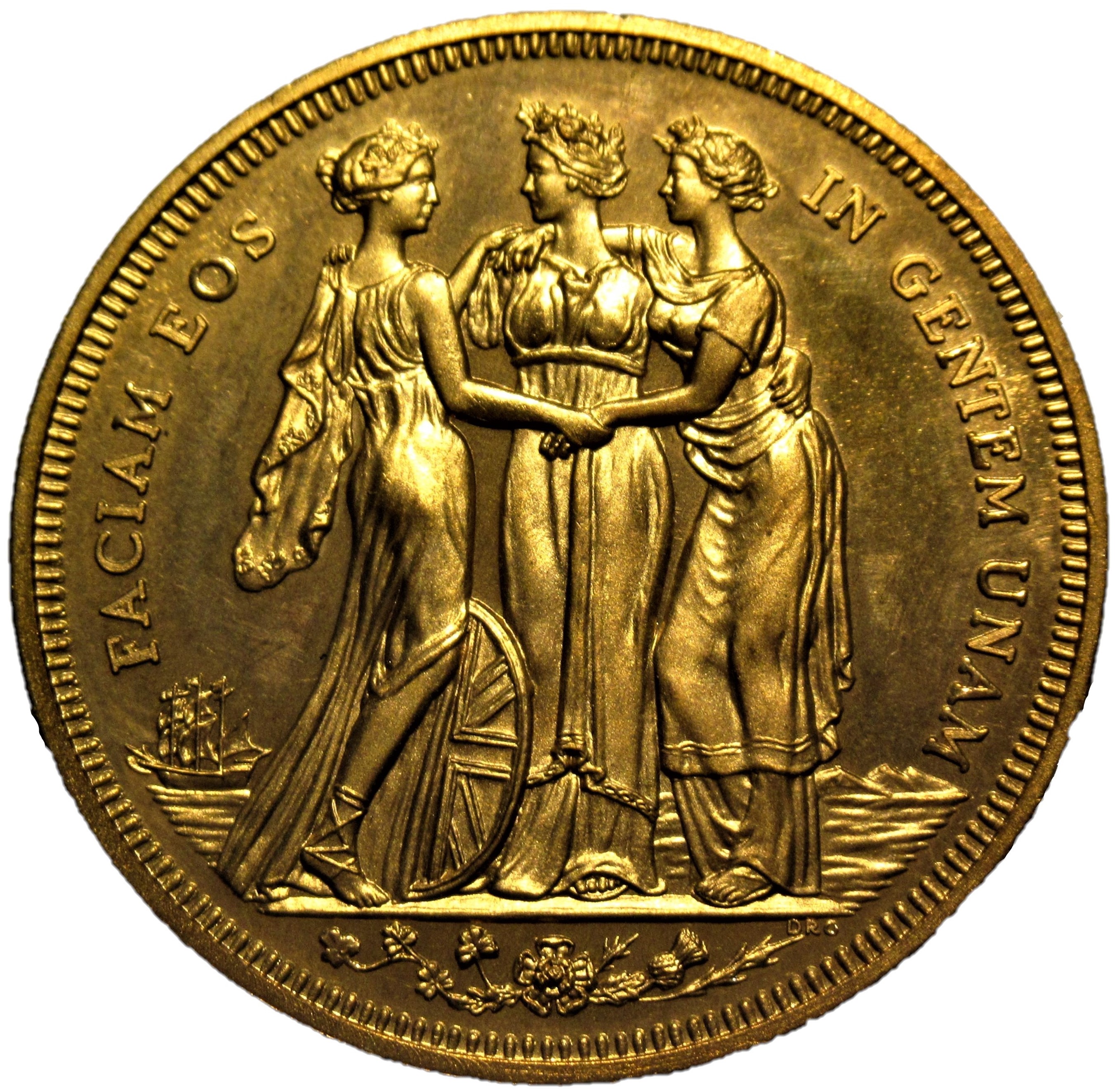 Описание: Алегорія «Три грації» стоять, корабель на задньому плані, мотив троянди та чортополоху в екзергу, латинська легенда навколо та зубчаста облямівка з обох боків.