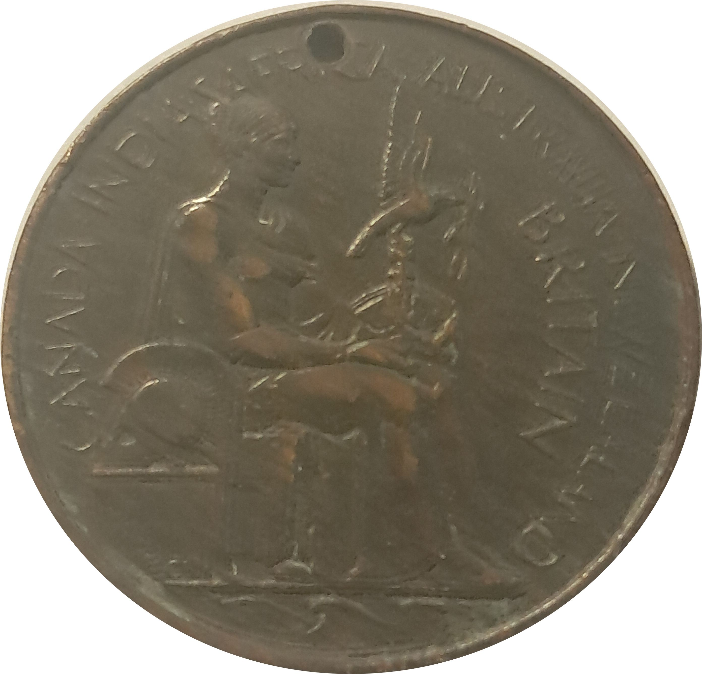 Описание: Британія сидить, дивлячись вправо, тримаючи корону з голубем і лавровою гілкою. Грецький стародавній шолом на п'єдесталі поруч.