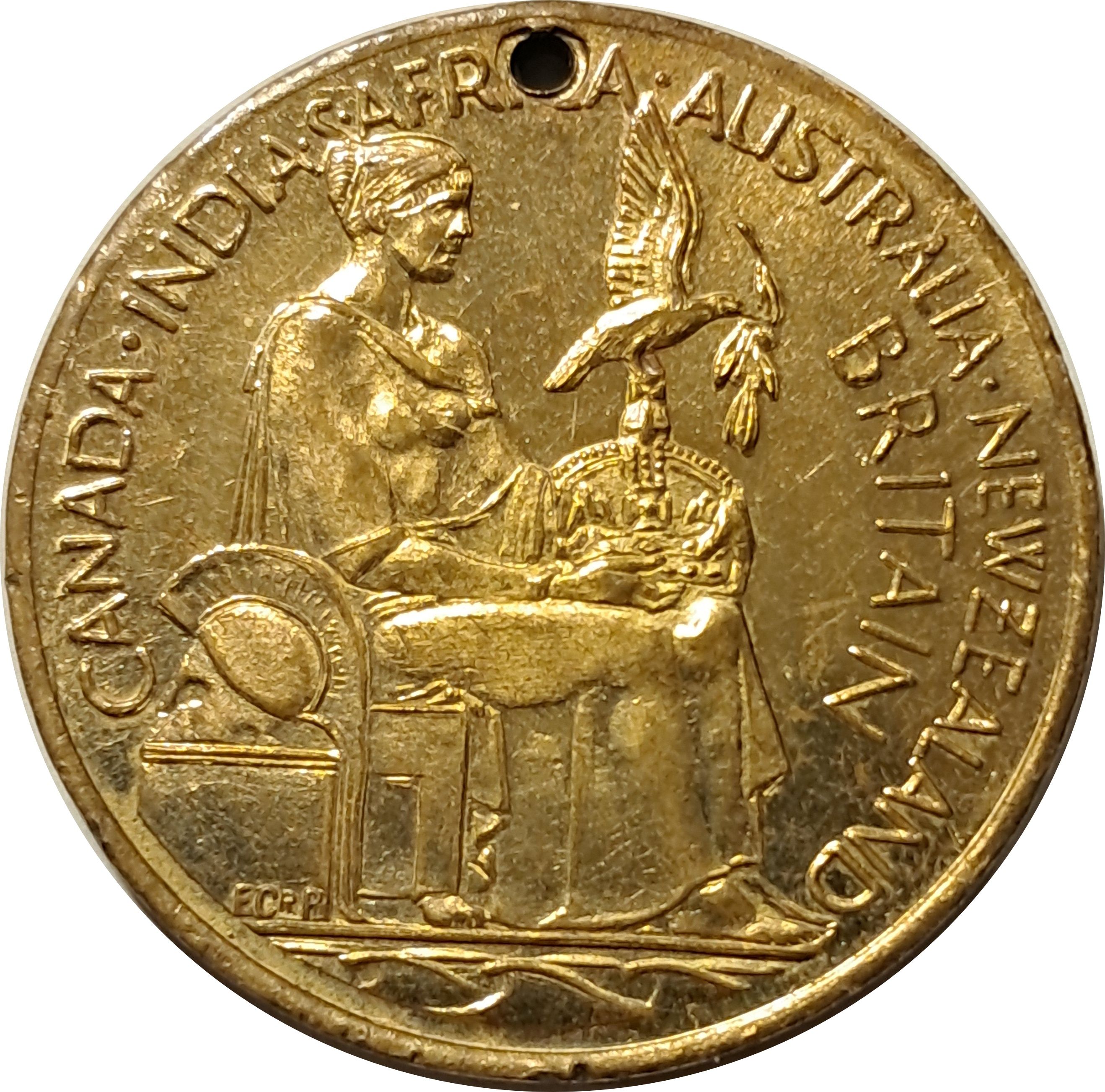 Описание: Британія сидить, дивлячись вправо, тримаючи корону з голубем і лавровою гілкою. Грецький стародавній шолом на п'єдесталі поруч.