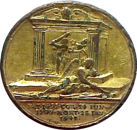 Описание: Квадратный монумент, увенчанный маской между двумя волютами и разделенный рифлеными пилястрами. На передней стороне находится барельеф, изображающий короля в образе Геракла с дубиной в руке, стоящего в храме и разрушающего папскую тиару и ключи, которые были помещены на алтарь. Сзади — костер из хвороста, символизирующий судьбу католиков, на который Генрих отправлял тех, кто отказывался признавать его верховенство. У подножия памятника стоит Гимен, держащий одну все еще горящую факел, символизирующую единственный брак, не расторгнутый к моменту смерти Генриха, в то время как пять погасших факелов у его ног олицетворяют предыдущие браки Генриха.