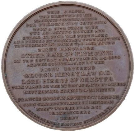 THIS CHAPEL WAS ERECTED BY HIS MAJESTYS COMMISSIONERS FOR BUILDING NEW CHURCHES UPON A SITE WHICH WITH TWO ADJOINING HOUSES AND BURIAL GROUND WAS PURCHASED AND FENCED BY VOLUNTARY CONTRIBUTIONS THE CEREMONIAL STONE WAS LAID BY THE RIGHT HONORABLE OTHER EARL OF PLYMOUTH ON THE 29th DAY OF SEPTEMBER A.D. 1820 AND THE CONSECRATION BY THE RIGHT REVEREND GEORGE HENRY LAW D.D. LORD BISHOP OF CHESTER TOOK PLACE ON THE 23 DAY OF JANUARY A.D. 1823 REVD. SAMUEL CRANE B.A. MINISTER FRANCIS GOODWIN ARCHITECT LONDON JOHN WALTHEW BUILDER BIRMINGHAM MESSRS. WETHERHEAD & Co IRONFOUNDERS DERBY THOMAS MOLE ESQR. HON SECRETARY.