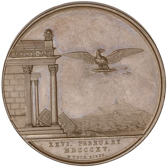 Описание: Французский орел, несущий молнию, летящий к французскому побережью с острова Эльба; храм Януса с разбитой дверью слева