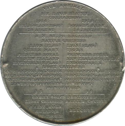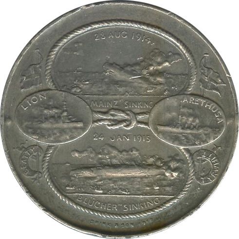 Описание: Два овальных медальона, расположенных один над другим и соединенных узлом. На верхнем изображен тонущий крейсер. На нижнем медальоне — корабль, лежащий на боку. По бокам два меньших медальона: слева — «LION», идущий на право. Над ними — флагшток с флагом адмирала и свитком. Справа — «ARETHUSA», идущий влево, над ним — флагшток с широким вымпелом коммодора и надписью.